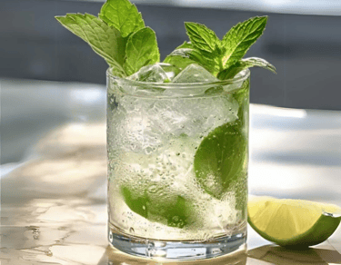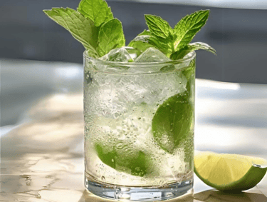 LIMÃO, RUM, SODA, HORTELÃ E GELO.